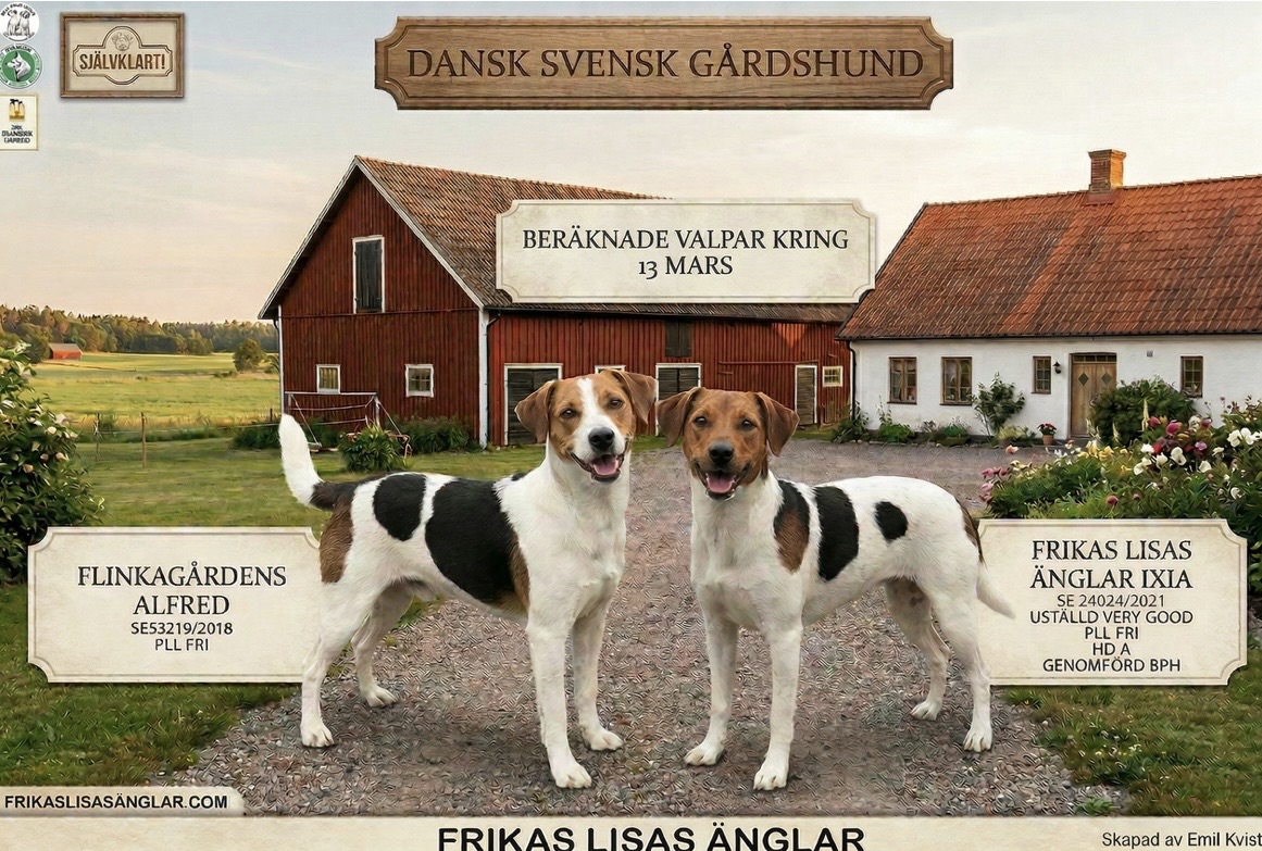 Vi har parat vår Ixia med Flinkagårdens Alfred 20260109. Nu kan vi bara hålla alla tummar och tassar för att vi kommer att få valpar kring den 13:onde Mars. Inavelsgrad 0,0% 20260112