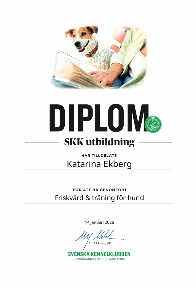 Vi har en grundläggande filosofi och det är att man ska ha god kunskap när man ska hantera djur. Därför har vi båda läst Svenska Kennelklubbens Hunduppfödare utbildning och Hundens beteende. Katarina har även läst Mera mentalitet och Hundavel och genetik. Jag är sedan 3 Juni 2024 godkänd aktiveringscoach och hundinstruktör och godkänd beteendecoach och hundpsykolog sen den 2 Juli 2025. Har även genomgått certifiering hundägare och hund.